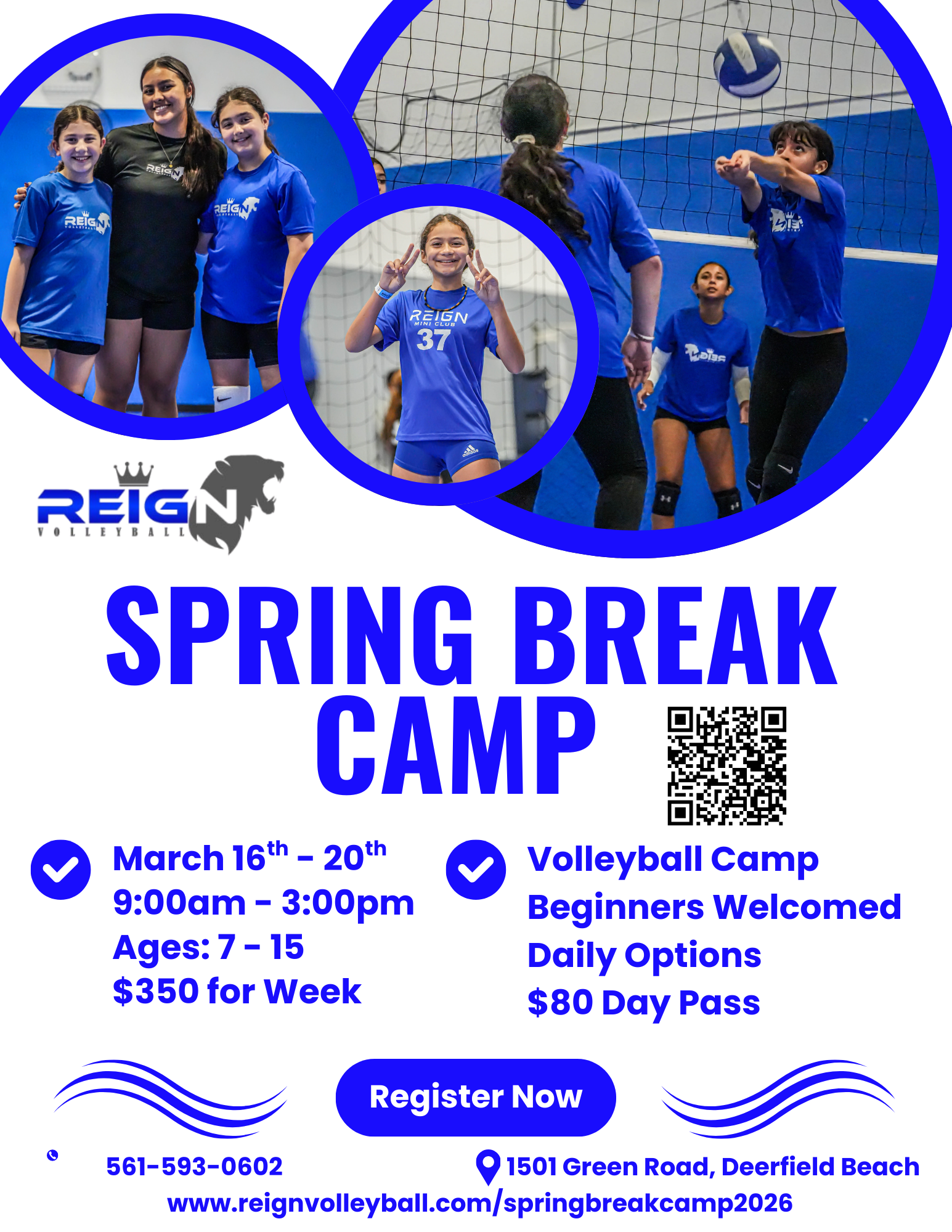 Our Spring Break Volleyball Camp is super fun and will keep your little athlete active during spring break. We focus on teaching volleyball skills, playing fun games, staying active, and building new friendships. Come see what Reign Volleyball Club is all about during our Spring Break Camp 2026