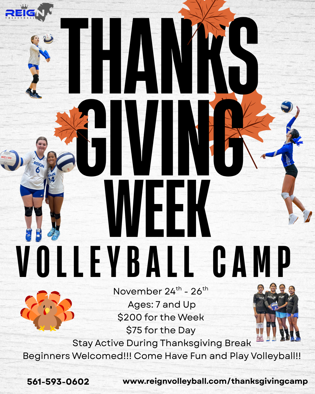 Join us for a three day volleyball camp over Thanksgiving Break 2025! Designed for players ages 7-16, this camp focuses on skill development and advancing volleyball player’s understanding of the game. Beginners always welcomed!! Come be a part of the Reign Family this Thanksgiving Break!!!